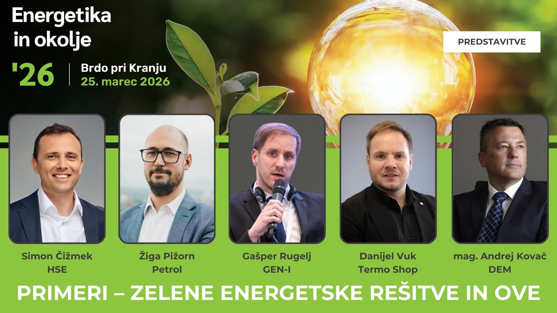 Med govorci bodo predstavniki vodilnih energetskih podjetij in industrije. Konkretne primere bodo med drugim predstavili Simon Čižmek (HSE), Žiga Pižorn (Petrol), Gašper Rugelj (GEN-I), Nejc Jamšek (HSE) in Dani Vuk (Termo Shop).